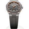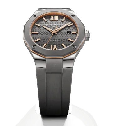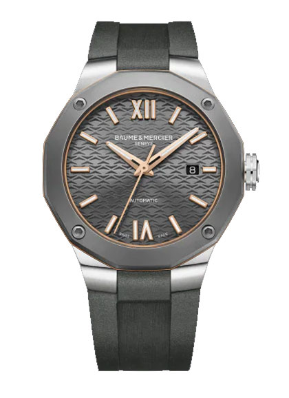 La Riviera renaît une nouvelle fois cette année dans les teintes subtilement grisées avec une déclinaison de la Riviera 42 mm Automatique « swiss made » boîtier acier et cadran ardoise sur bracelet en caoutchouc gris interchangeable. La lunette en titane microbillé fixée par quatre vis fonctionnelles sur le boîtier confère à cette pièce contemporaine un look furtif et engagé. Le pedigree sportif ne se conteste pas. Il est subtilement adouci par un cadran d’une belle teinte « ardoise » laquée, mis en lumière par des décors « vagues » ton sur ton ainsi que par des chiffres romains et des index.