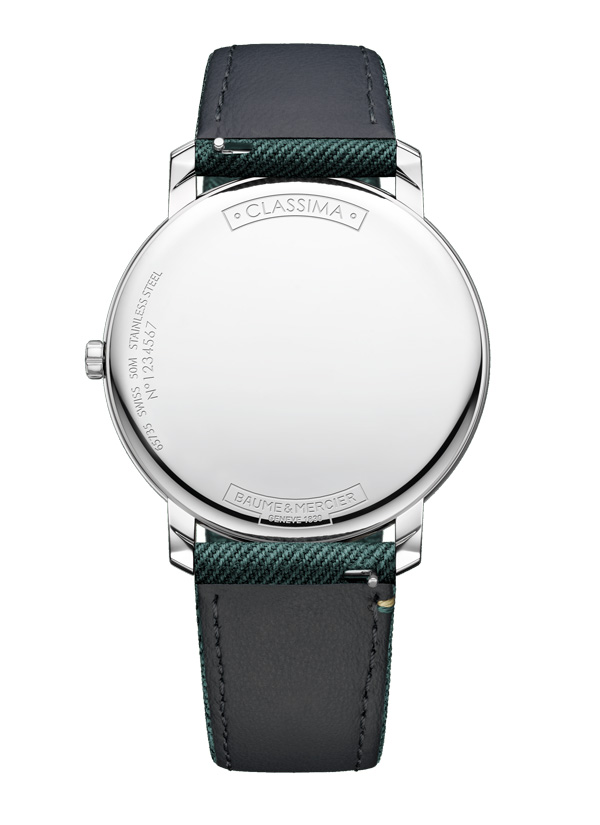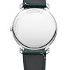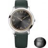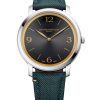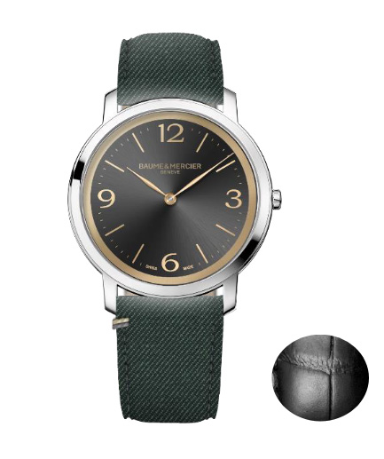 Le modèle M0A10704, dont le cadran gris météore satiné soleil avec réhaut doré est ponctué de chiffres arabes, d’index et d’aiguilles feuille dorés. Ses bracelets sont en tissu vert (Super 100) points sellier, et en alligator noir.