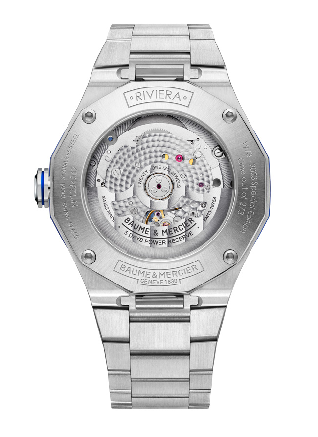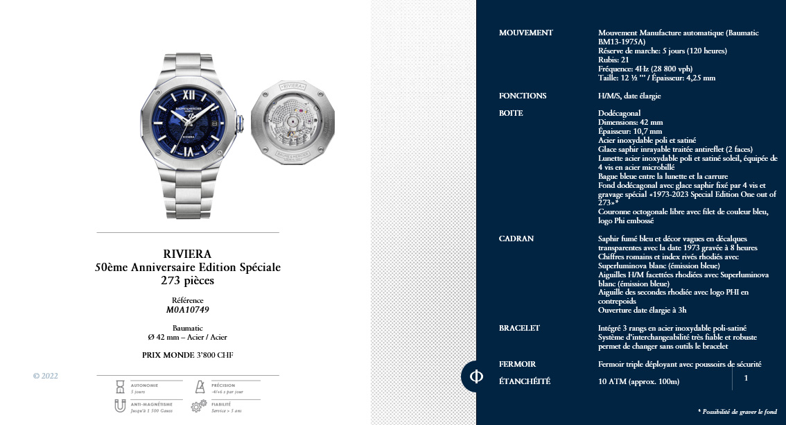 Pour son 50ème anniversaire en 2023, la Maison est fière de revisiter son modèle Riviera Baumatic en créant la “Riviera Edition Spéciale 50ème Anniversaire” – limitée à 273 pièces – qui rend hommage au style et à l’histoire de la collection. Cette édition spéciale se pare de subtiles détails tels que la signature secrète “1973” sur le cadran saphir bleu transparent, le logo emblématique “Phi” de la Maison sur le contrepoids de l’aiguille des secondes et un anneau bleu dans la carrure qui ajoute encore plus de sophistication à la pièce.