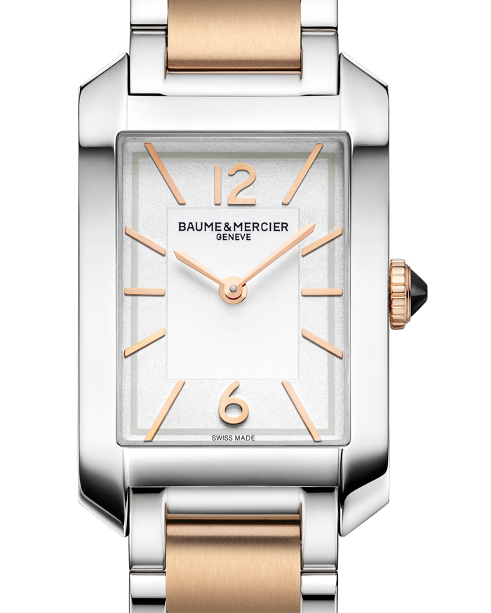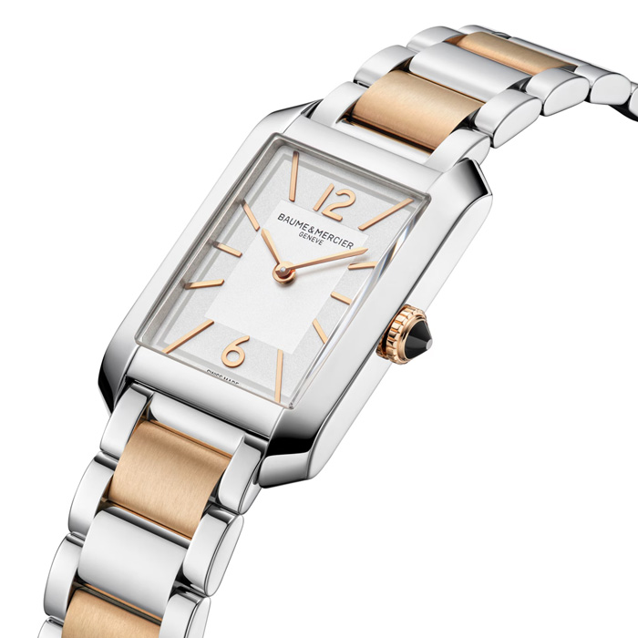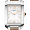 Petite montre délicate dotée d’un boîtier rectangulaire et d’un bracelet en acier inoxydable et or 18 carats satiné et poli, cette montre-bracelet de luxe pour femme arbore une allure intemporelle. Elle dispose d’une glace saphir bombée inrayable et d’un boîtier avec fond.