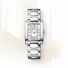 Montre pour femmes, boîte en acier inoxydable, 22.90mm de largeur, cadran nacre avec 11 diamants (0.0715 carats), finition polie, glace saphir antireflet en dessous, bracelet en acier inoxydable, mouvement quartz suisse, étanche jusqu’à 50 mètres.