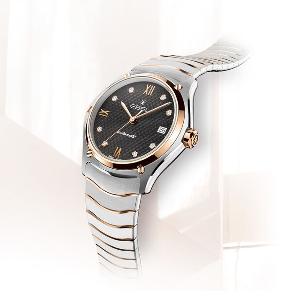 Montre EBEL Sport Classic Lady, boîte en acier inoxydable et or rose 18K 5N, Ø 29mm, cadran galvanique anthracite avec motif E inversés estampés, 8 diamants (0.0512 carats) et chiffres romains plaqués or rose 4N, glace saphir avec traitement antireflet dessous, bracelet à maillons vague bicolore en acier inoxydable et or rose, boucle déployante, mouvement automatique suisse , étanche jusqu’à 50 mètres