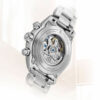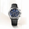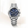 Montre homme EBEL 1911, boîte en acier inoxydable, Ø 44mm, cadran galvanique bleu avec index appliques et Super-LumiNova®, guichet date à 4h30, glace saphir avec traitement antireflet dessous, fond en glace saphir, bracelet en acier inoxydable, boucle déployante, livrée avec un bracelet en cuir, mouvement chronographe automatique suisse, étanche jusqu’à 10 bar