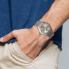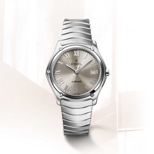 Montre EBEL Sport Classic, boîte en acier inoxydable, Ø 37mm, cadran galvanique brun terre avec chiffres romains plaqués rhodium, glace saphir avec traitement antireflet dessous, bracelet à maillons vague en acier inoxydable, boucle déployante, mouvement automatique suisse, étanche jusqu’à 5 bar