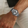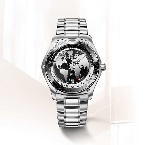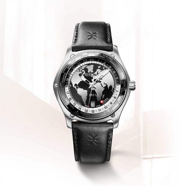 Montre homme EBEL 1911, boîte en acier inoxydable avec lunette en céramique noire, Ø 42mm, cadran galvanique avec continents plaqués en rhodium, guichet date à 6h00, fonction Worldtimer avec heure exacte dans 24 lieux représentant les 24 fuseaux horaires de référence sur la lunette en ceramique, glace saphir antireflet dessous, fond en glace saphir, bracelet en acier inoxydable, boucle déployante, livrée avec un bracelet en cuir de veau noir, mouvement automatique suisse, étanche jusqu’à 10 bar
