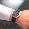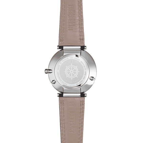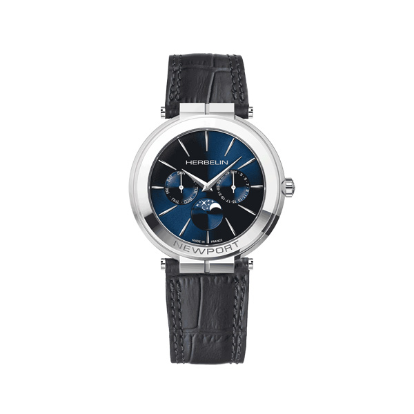 Emblématique de la maison Française, Newport arrive métamorphosée et arbore une silhouette fine et épurée. D’une épaisseur de seulement 6,95 mm c’est une première pour la Newport. Le boîtier en acier inoxydable de 41,5 mm de diamètre reste fidèle aux codes historiques par ses attaches centrales et sa couronne gravée d’une roue marine. Découpé en trois facettes minutieusement ciselées, sa finition polie sculpte la lumière. Ponctuée d’un cadran bleu marqué d’index doré et d’une ouverture accueillant un indicateur des phases de Lune, cette montre est habillée d’un bracelet en cuir façon aligator. Newport Slim a été dessinée, conçue et assemblée dans les ateliers Herbelin en France.