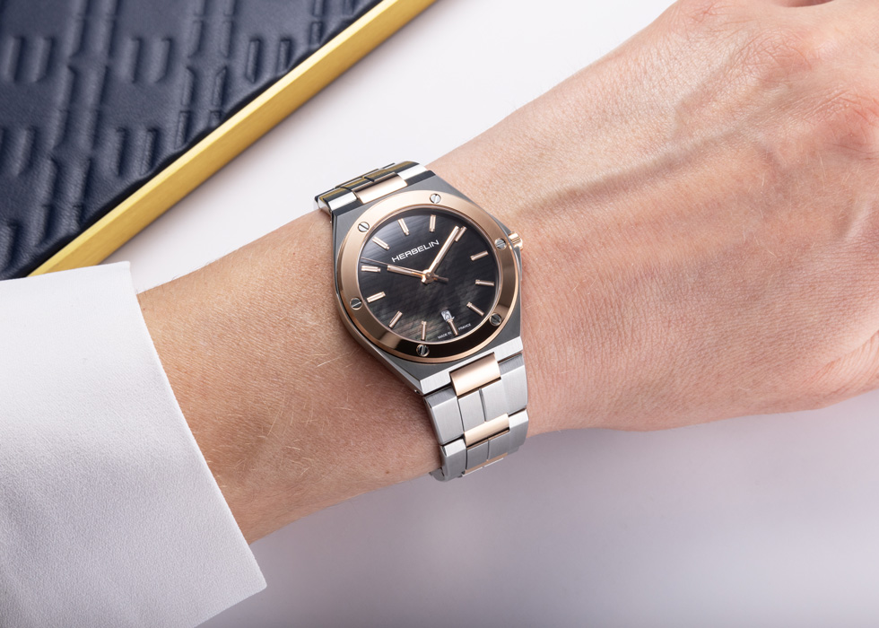 La montre pour femme CAP CAMARAT Bicolore & Nacre Noire allie élégance et raffinement. C’est un modèle au design travaillé, véritable hommage à la beauté captivante du Cap Camarat, situé dans le sud de la France. Son cadran en nacre noire fait référence aux profondeurs marines, offrant un contraste saisissant avec le boîtier et le bracelet en acier bicolore. Le jeu de lumière sur les surfaces polies et brossées du boîtier rappelle les reflets du soleil sur les vagues, jouant sur les tons chauds du PVD Or Rose et les tons bleutés de l’acier inoxydable. Les index en or rose déorant le cadran sont traités avec une matière luminescente tels les rayons du soleil. La lunette, ornée de six vis, renforce le caractère luxueux de la montre. Fonctionnelle autant qu’esthétique, la montre CAP CAMARAT Bicolore & Nacre Noire intègre un guichet de date discret à 6 heures et est propulsée par un mouvement quartz suisse précis. Conçue pour résister à l’eau jusqu’à 100 mètres et protégée par un verre de saphir, cette montre combine durabilité et style : elle est idéale pour un usage quotidien. Ce modèle est plus qu’une simple montre : c’est une pièce horlogère luxueuse qui célèbre l’harmonie colorée du Cap Camarat.