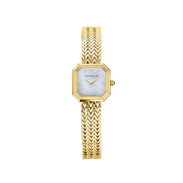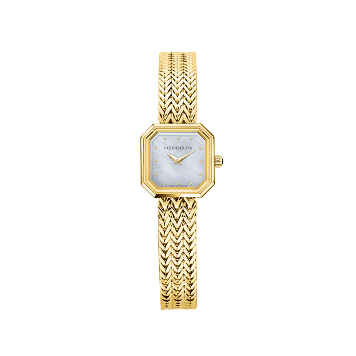 La collection Octogône est identifiable au premier coup d’œil grâce à son esthétisme minimaliste. Le bracelet tissé d’une maille fine en PVD or jaune apporte une touche d’éclat à cette montre. Le cadran en nacre blanche véritable est délicatement survolé d’aiguilles de type dauphine. Les montres Herbelin sont issus d’un savoir-faire horloger traditionnel français.