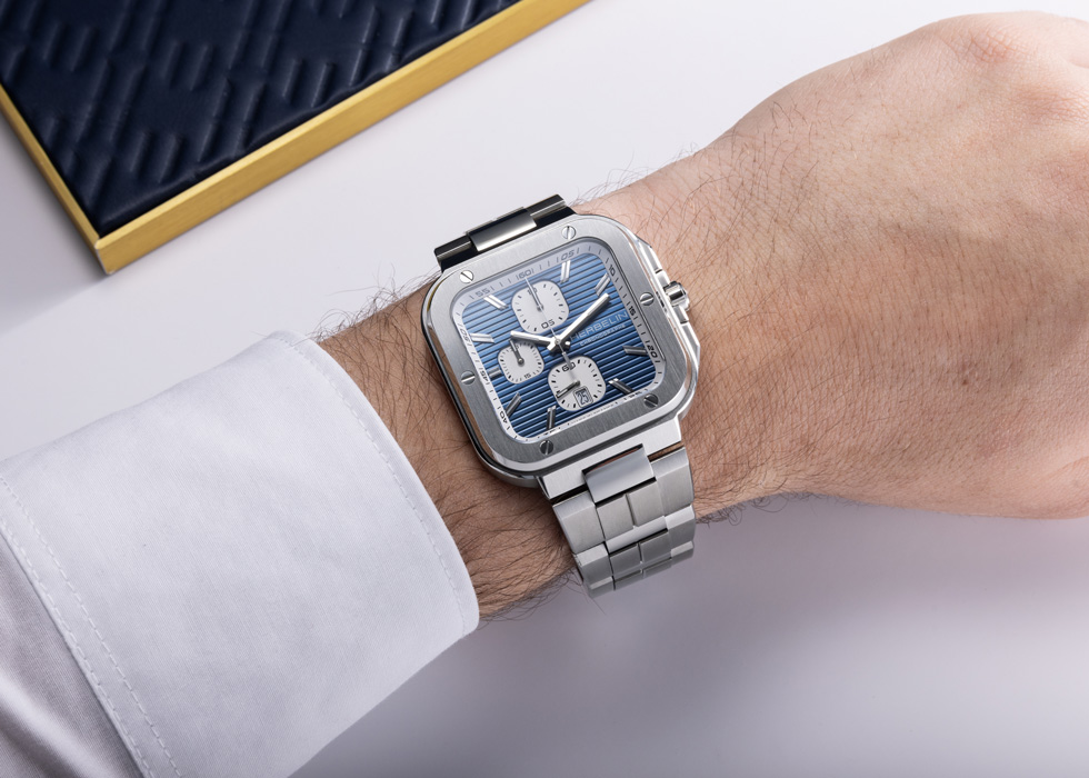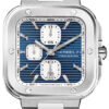 La CAP CAMARAT Square Chronographe Bleu est un modèle masculin qui mêle élégance sportive et précision horlogère. Ce modèle se distingue par un boîtier en acier inoxydable au design néo-vintage, où la robustesse est accentuée par des facettes polies et une lunette ornée de six vis décoratives alignées avec les index.