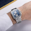 Ces compteurs affichent la petite seconde, le 1/10e de seconde et les 30 minutes, intégrant ainsi toutes les fonctions essentielles d’un chronographe. Le contraste saisissant entre les compteurs blancs et le cadran bleu assure une excellente lisibilité.