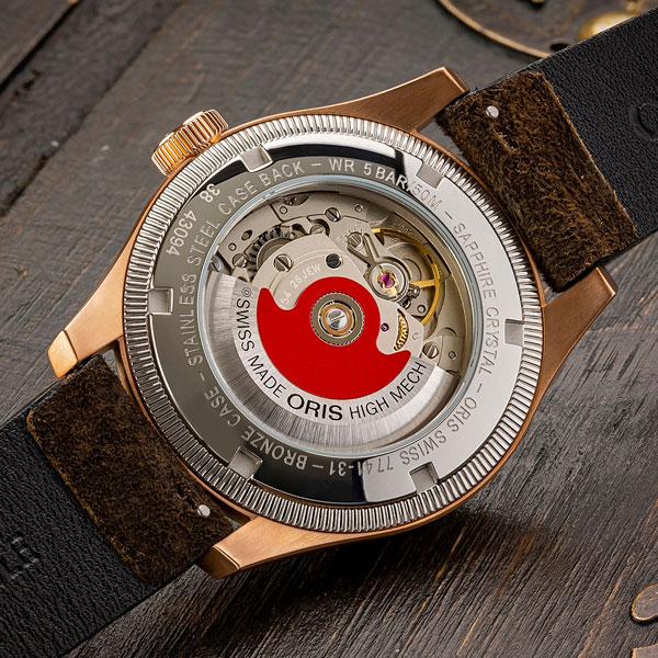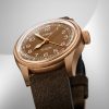Oris célèbre le rôle historique de sa montre emblématique. La Big Crown Pointer Date s’enveloppe de bronze massif, jusque sur son cadran, en utilisant une finition sur-mesure pour rendre chaque pièce unique. Le boîtier et le cadran en bronze illustrent l’héritage industriel d’Oris et son approche innovante. Le cadran a subi un traitement chimique avant d’être recouvert d’une laque mate transparente, faisant ainsi de chaque pièce un modèle unique.
