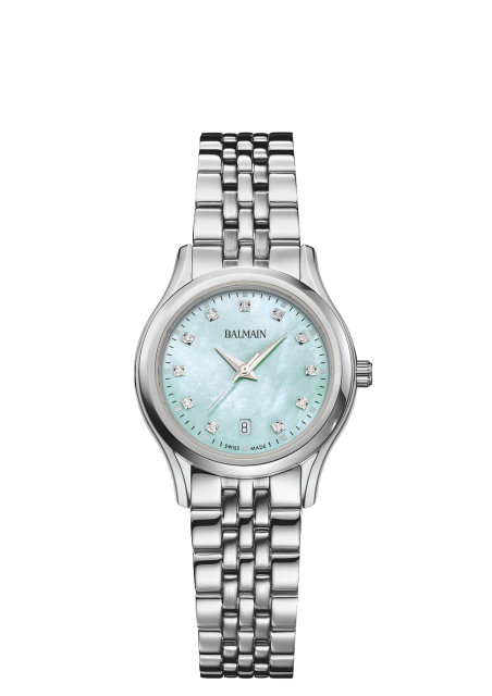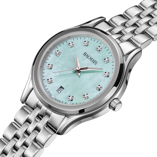 La Balmain Beleganza est une montre féminine gracieuse qui allie élégance intemporelle et design moderne inspiré de la Haute Couture parisienne. Son cadran en nacre couleur menthe, serti de 11 diamants Top Wesselton VS-SI totalisant 0,041 carat, apporte une touche de douceur.