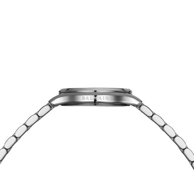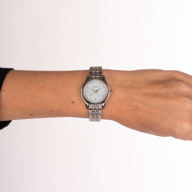 Le boîtier en acier inoxydable de 27,50 mm, avec un profil fin de 6 mm et un bracelet assorti, offre un style au quotidien. Cette montre Swiss Made est dotée d’un verre saphir.