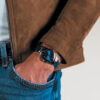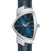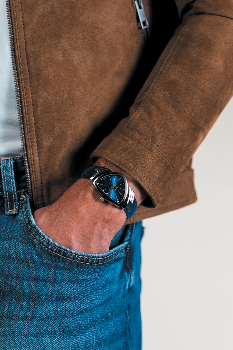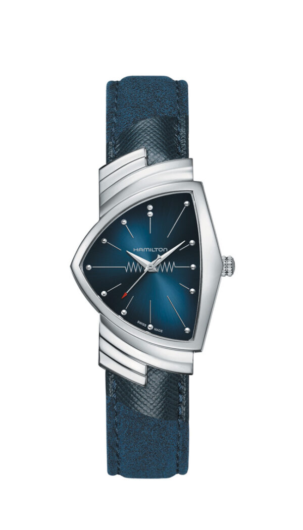 En 1957, Hamilton lance la première montre électrique, la Ventura. Cette montre révolutionnaire marque le début d’une nouvelle ère dans le monde de l’horlogerie, s’imposant comme un emblème du design futuriste et un symbole d’innovation. Inspirée par le tube Blue Suede Shoes d’Elvis Presley, la Ventura Quartz est équipée d’aiguilles des heures, des minutes et des secondes nickelées ainsi que d’un mouvement à quartz garant d’une grande fiabilité et logé dans un boîtier triangulaire emblématique en acier inoxydable. Un bracelet en alcantara d’un bleu intense vient compléter un cadran bleu foncé qui évoque les célèbres chaussures du King dont parle la chanson.