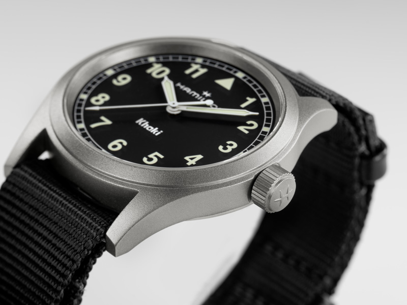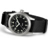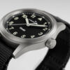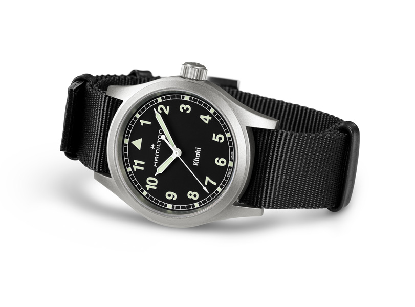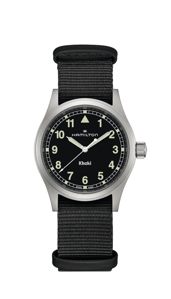 Grâce à son design sobre, la Khaki Field quartz marque le retour à l’héritage militaire d’Hamilton. Le cadran affiche une typographie claire avec des chiffres arabes droits et une minuterie chemin de fer.