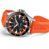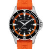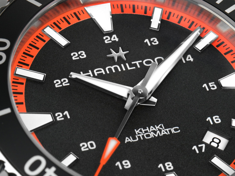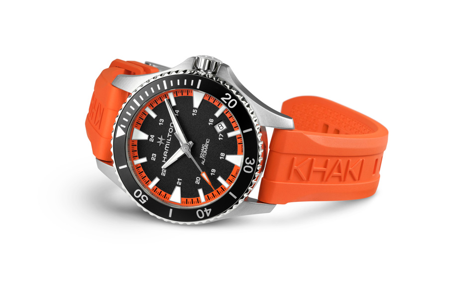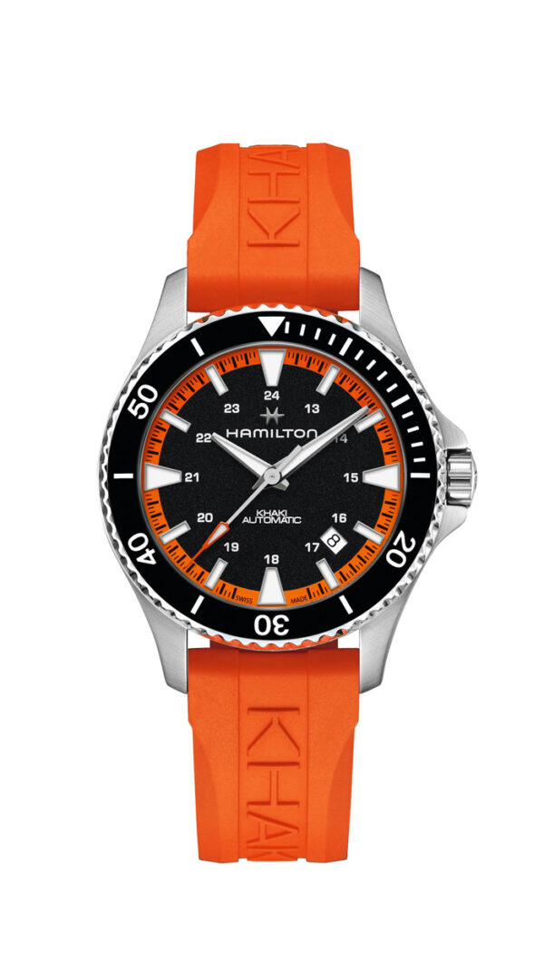 Sur la plage, à la piscine ou au fond de l’océan, la nouvelle Khaki Navy Scuba va faire des vagues dans l’univers du style. Conçue pour les marins, les plongeurs, les surfeurs et les simples baigneurs des temps modernes, elle est aussi belle que fonctionnelle grâce à son bracelet en caoutchouc orange mandarine et son cadran noir contrastant. Pratique pour chronométrer votre brasse coulée, votre séance de sport ou la durée de votre bronzage, elle vous permettra de garder votre sang-froid en toutes circonstances.