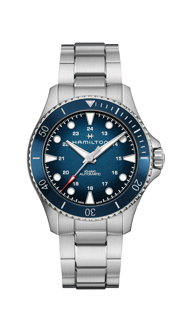 Caractéristiques Référence H82505140 Calibre H-10 Collection Khaki Navy Mouvement Automatique Dimensions du boîtier 43mm Couleur du cadran Bleu Matériau du boîtier Acier inoxydable Verre Saphir Largeur corne Largeur corne 22 mm Étanchéité jusqu’à 30 bar (300 m) / 435 psi Nivachron Oui -