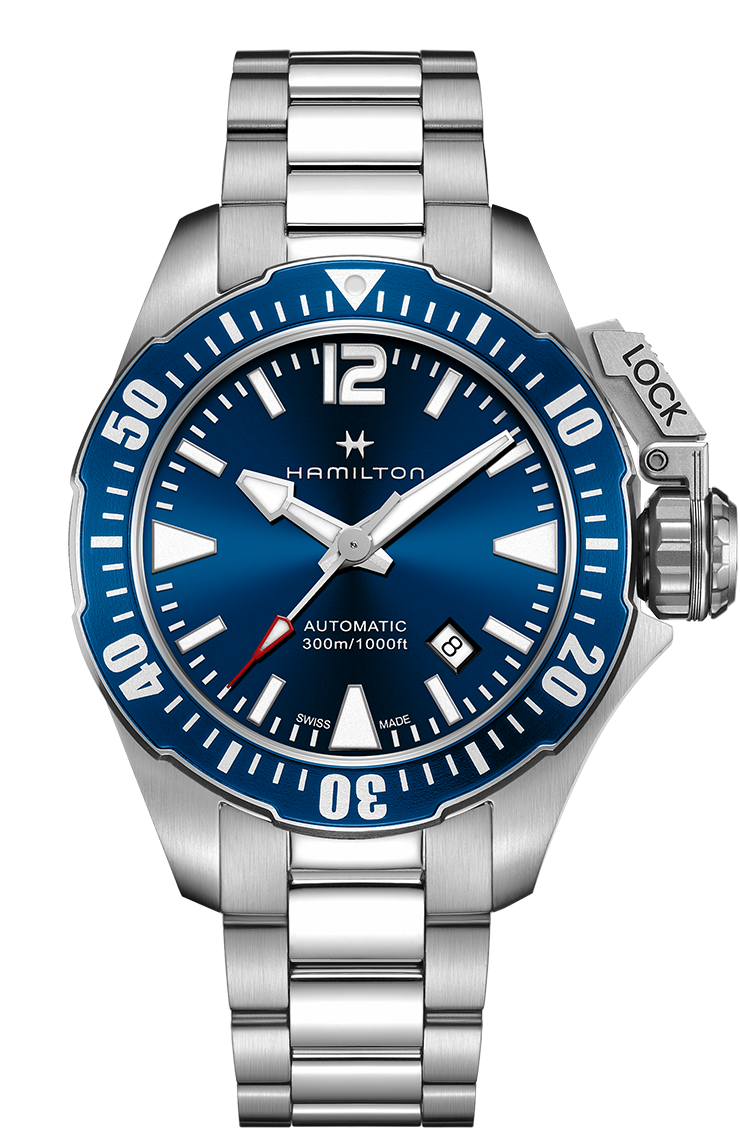 Créée pour les plongeurs de la marine américaine et portée à l’écran dans le film de 1951 Les Hommes-grenouilles, cette nouvelle montre de plongée a été pensée pour répondre aux exigences strictes d’une utilisation sous-marine. Le boîtier en titane de 46 mm, étanche jusqu’à 100 bars (1 000 mètres), possède une lunette tournante unidirectionnelle en aluminium rouge. La version dotée d’un boîtier de 42 mm en acier inoxydable se décline en bleu ou en noir.