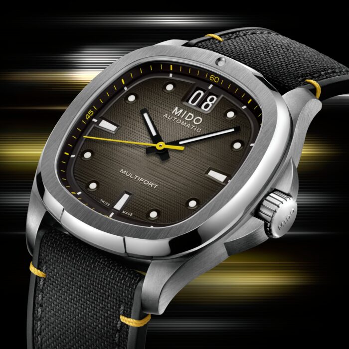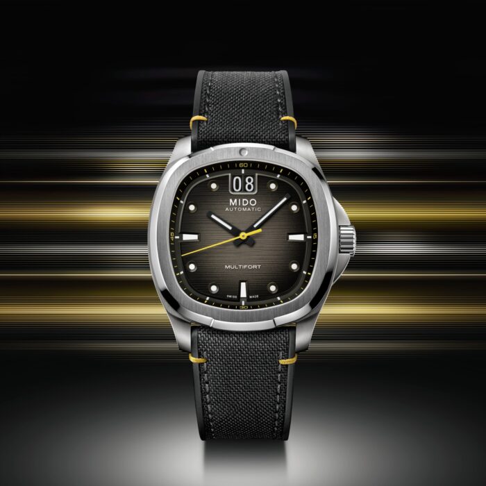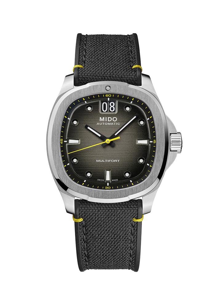 Tout en restant fidèle aux codes forts de la Multifort TV Big Date, MIDO dévoile une version acier au cadran dégradé de noir à gris, soulignée de touches énergétiques jaunes.