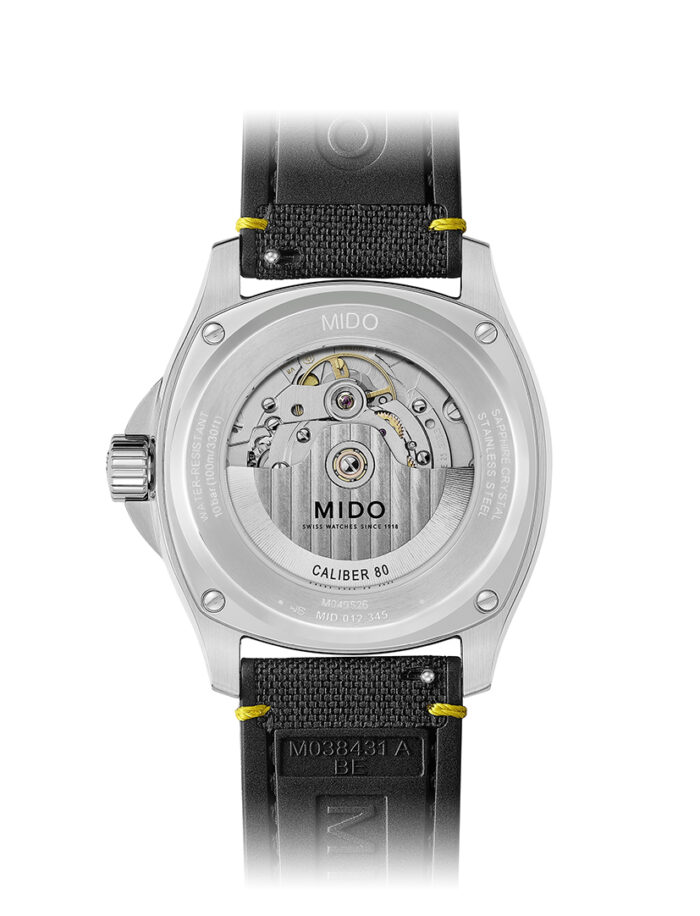 Au dos, la Multifort TV Big Date dévoile son calibre mécanique haute précision grâce à un fond transparent. Le Calibre 80, équipé d’une masse oscillante décorée de Côtes de Genève et gravée du logo MIDO, assure une