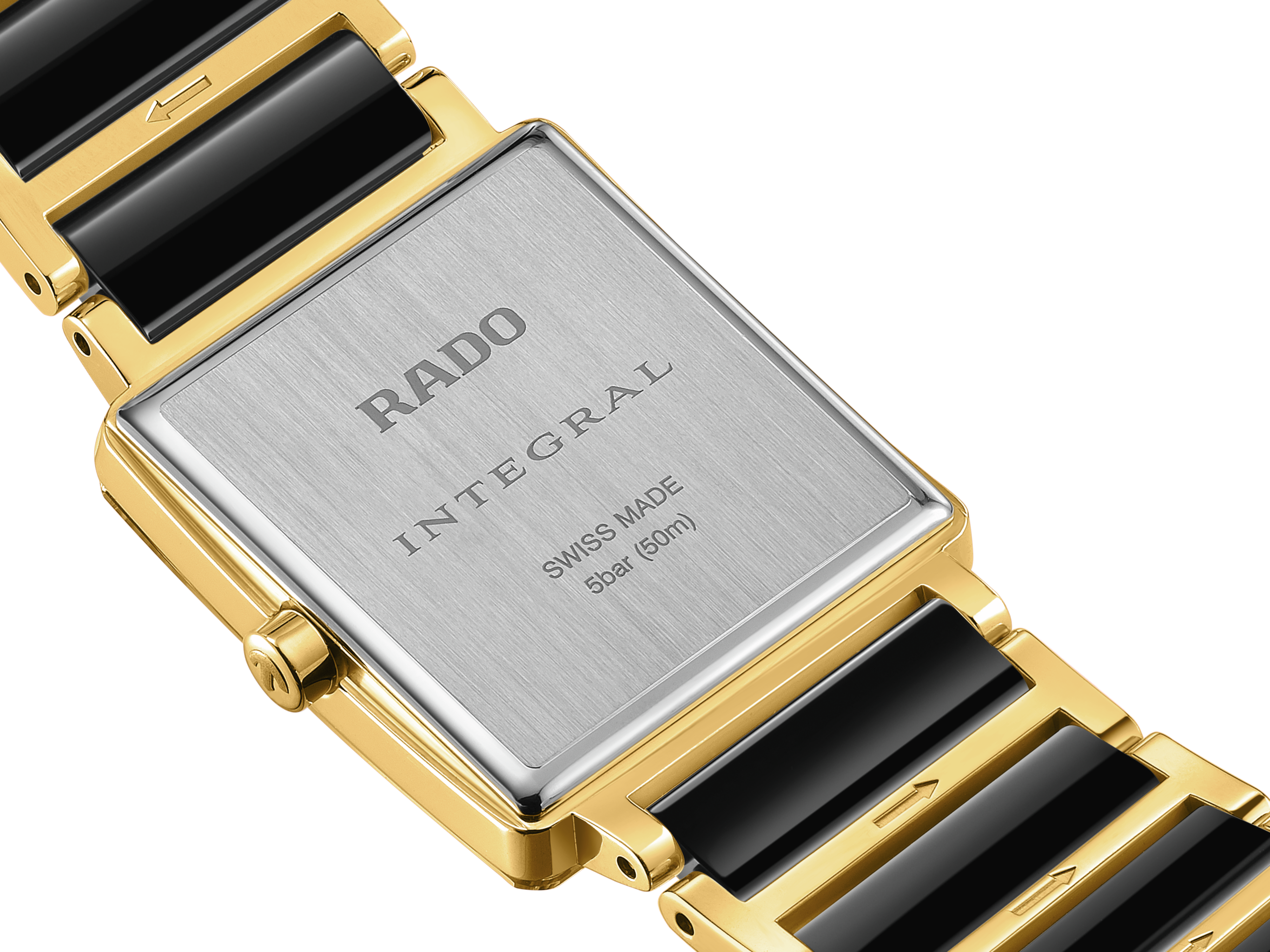 Le boîtier en acier inoxydable arbore une teinte or jaune, à l’image des aiguilles qui gravitent au-dessus des diamants. Le bracelet en acier inoxydable couleur or jaune encadre des maillons centraux en céramique haute technologie noire brillante. Le verre saphir bord à bord, galbé et biseauté, bénéficie d’un traitement antireflet et d’une métallisation noire pour une lisibilité parfaite.