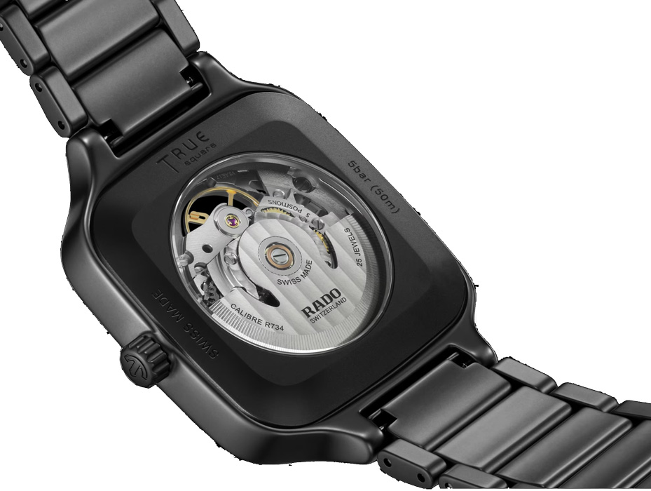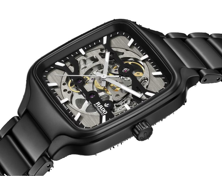La Rado True Square Skeleton allie matériaux de haute technologie et savoir-faire exceptionnel. À l’intérieur du boîtier monobloc en céramique haute technologie noire mate de 38 mm est logé un mouvement squelette R808 comprenant 25 rubis et offrant une réserve de marche de 80 heures.