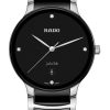 Le modèle classique Centrix Quartz Diamonds a été revisité non seulement sur le plan technique, mais aussi esthétique. Désormais, il présente un boîtier galbé qui se fond merveilleusement avec le bord du verre saphir arrondi. Les cornes ajustées du boîtier et le bracelet en acier inoxydable poli avec maillons intermédiaires en céramique haute technologie noire viennent compléter l’apparence générale de ce garde-temps emblématique. Le cadran laqué noir incrusté de 4 diamants et arborant le logo « jubilé » imprimé, se marie à la perfection aux aiguilles couleur rhodium. Grâce aux PreciDrive et HeavyDrive de son mouvement à quartz calibre R073, cette montre est plus précise et résistante aux chocs. Elle présente une étanchéité jusqu’à 50 m.