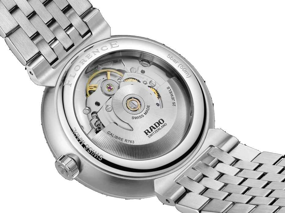 Sous le fond de boîtier en verre saphir bombé se cache l’âme de la Florence : le calibre automatique R763.