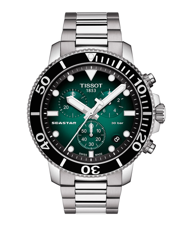 Sophistication ultime en matière d’équipement de plongée, autant sur le plan esthétique que technique, la Tissot Seastar 1000 Chronograph incarne le style et la performance, sans compromis. Dédiée à la plongée, elle offre un look sportif et des fonctionnalités indispensables sous l’eau. Parfaitement fiable jusqu’à une pression de 30 bar (300m), elle est la preuve qu’une montre de sport sous-marin et un chronographe peuvent être conciliés en un même objet. Le thème de la plongée est omniprésent avec des éléments tels qu’une lunette unidirectionnelle en aluminium, des aiguilles et index luminescents, une couronne et un fond de boite vissés. Enfin, la collection Tissot Seastar 1000 offre une multitude de choix concernant le bracelet : caoutchouc, maille milanaise, bi-matière, acier équipé d’une boucle de plongée.