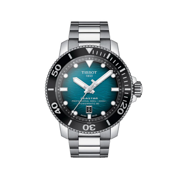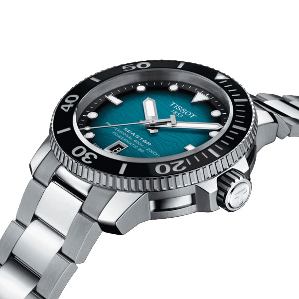 La Tissot Seastar 2000 Professional est le modèle de montre de plongée automatique par excellence. La norme ISO 6425 inscrite sur le fond de boîte transparent vissé certifie l’appellation « montre de plongée ». Parfaitement fiable jusqu’à une pression de 60 bar (600m), elle est la preuve qu’une montre de sport sous-marin et un garde-temps automatique sophistiqué peuvent être conciliés en un même objet. Elle dispose de fonctionnalités et éléments indispensables pour la plongée tels qu’une lunette unidirectionnelle en céramique, des aiguilles et index luminescents revêtus de Super-LumiNova®, une couronne et un fond de boite vissés ainsi qu’une valve à hélium, offrant une sécurité pour la plongée en saturation. Aussi, les cadrans des Tissot Seastar 2000 Professional arborent des motifs rappelant l’univers océanique et subaquatique.